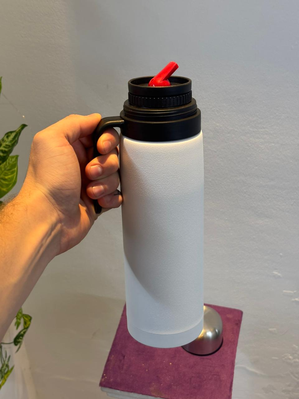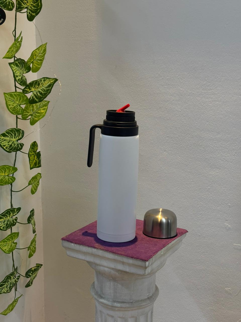 Este termo de acero inoxidable de 1 litro, con media manija, ofrece un agarre cómodo y seguro para el uso diario.