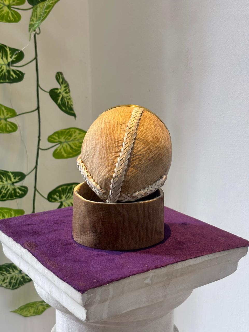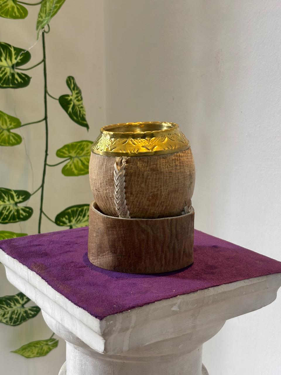 Cuenta con base de cuero crudo, que completa su diseño rústico y elegante, y una virola de bronce cincelada que le da un toque distintivo y de gran presencia.